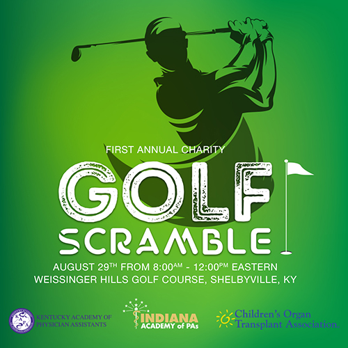 Join the Kentucky Academy of Physician Assistants (KAPA) and the Indiana Academy of Physician Assistants (IAPA) for our First Annual Charity Golf Scramble, benefiting the Children’s Organ Transplant Association, on August 29th at Weissinger Hills Golf Course in Shelbyville, Kentucky. We will kick off the day at 8:30a with remarks from our beneficiary and KAPA/IAPA leadership, followed by a “shotgun” style start on the course. Lunch will be provided at the clubhouse as teams finish for the day. All of the proceeds from the event will go to COTA, and to establish two scholarships for PA students in Kentucky and Indiana.